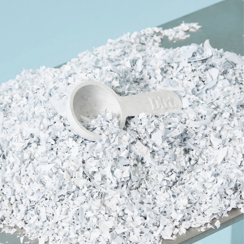 We melt the packs, spout, lid and all. The melted plastic is then remolded into its new incarnation: a 100% recycled scoop for our machine wash.