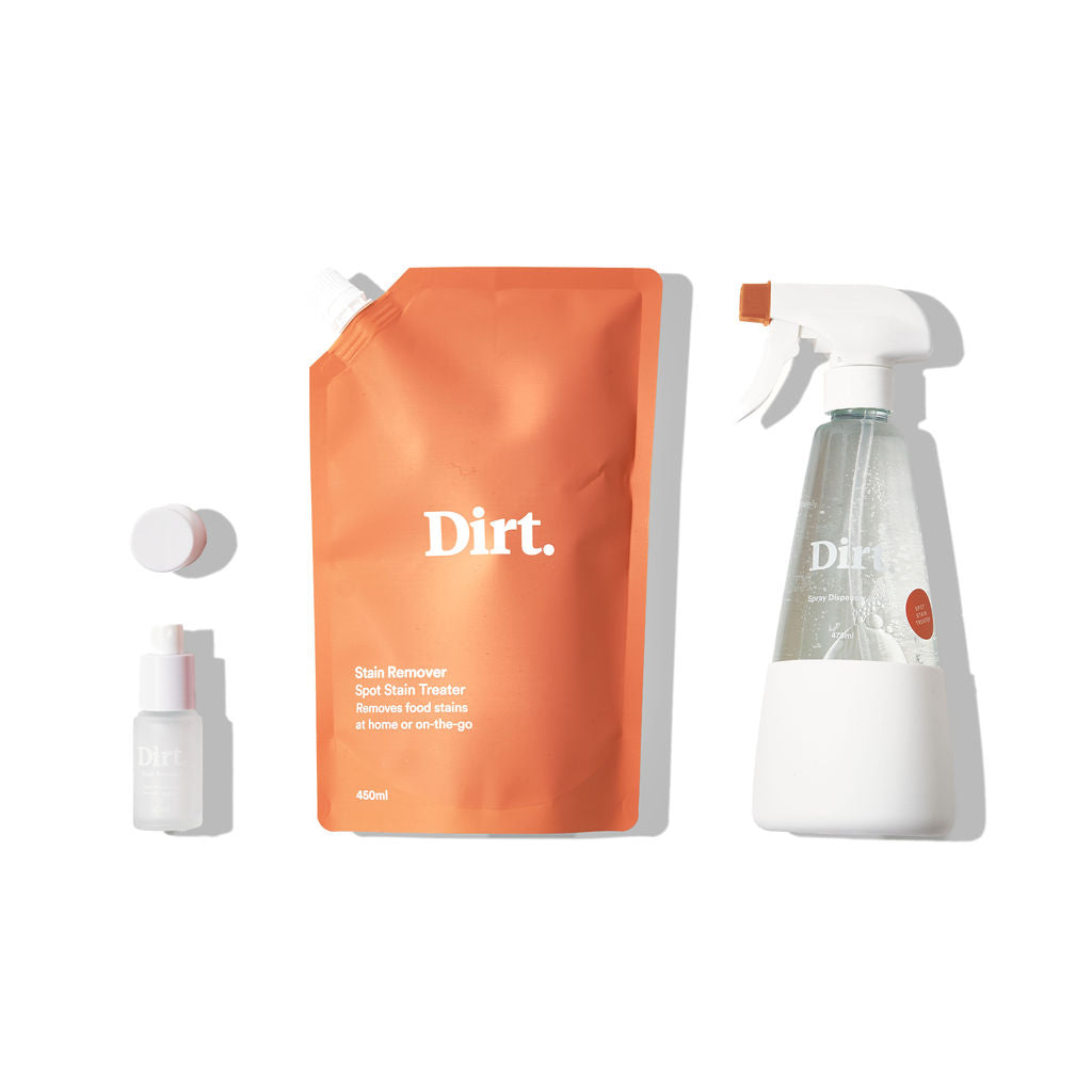 The Food and Drink Spot Stain Treater comes with a complete set - a full Dispenser Spray Bottle, full Carry On Spray and a Refill Pack. This Spot Treater works specifically well on dye-based stains such as berries, wine, coffee and ink. Target the stain directly and leave for 5 minutes or up to 30 minutes (no longer) before popping it in the wash or blot with water to remove any residue.